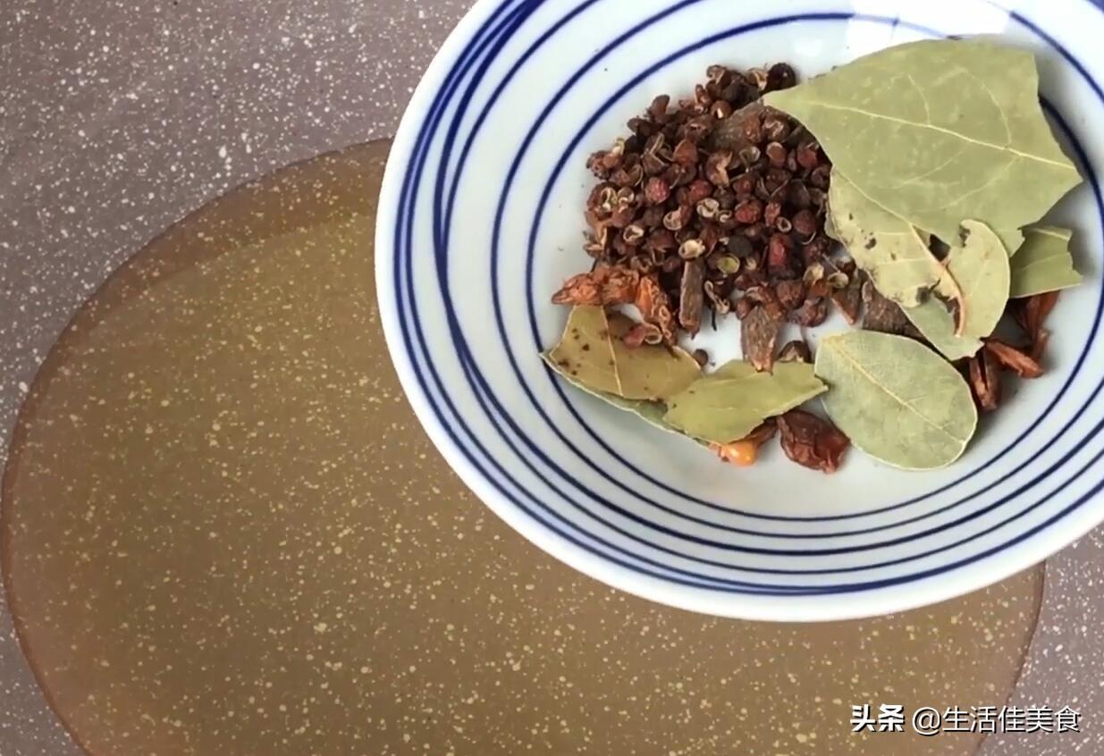 第五步:起锅,倒入适量的食用油,再下入一个八角、一小节桂皮、三张香叶、一小把花椒,开小火把香料炸香,炸香之后把香料捞出扔掉。