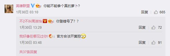 在周淑怡晒出cos锐雯的服装和胡萝卜道具的微博下面,我们看到了公然“开黄腔”的英雄联盟官博——