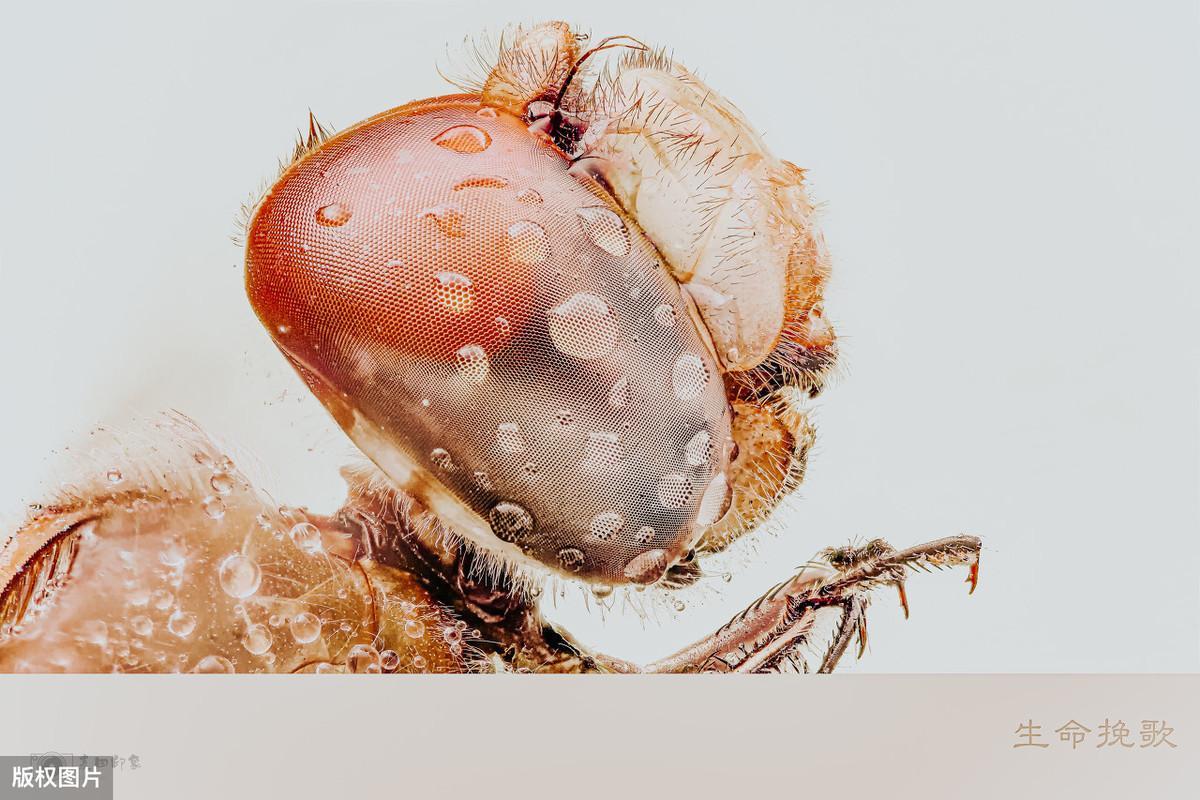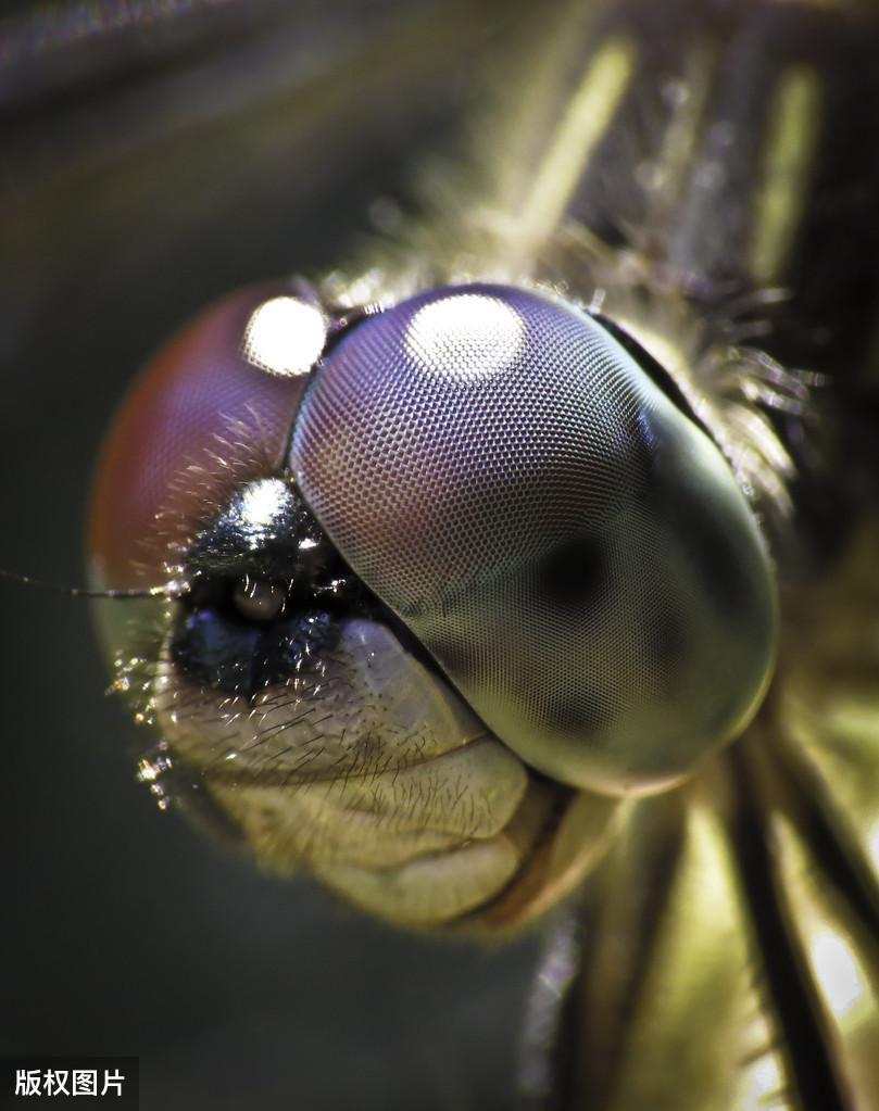 有了决定飞行速度的翅膀还不够,毕竟飞行的方向上不会空无一物,如果一味的高速飞行撞上途中的花花草草就不好了,于是蜻蜓还进化出了一双无敌复眼,眼睛总数量冠绝昆虫界。它们的复眼又大又鼓,占据着头的绝大部分,且每只复眼由数量极多的“小眼”构成,这些“小眼”都与感光细胞和神经相连,可以辨别物体的形状大小,蜻蜓的复眼形状为球形,弧形的表面相较于人类的眼睛拥有更完美的立体视觉,加上可自如转动的头部,大大增加了蜻蜓的视野范围,能真正做到眼观六路八方。除了拥有出类拔萃的视觉能力蜻蜓的复眼还有测速能力。当物体在复眼前移动时,每一个“小眼”依次产生出反应,经过加工就能确定出目标物体的运动速度。