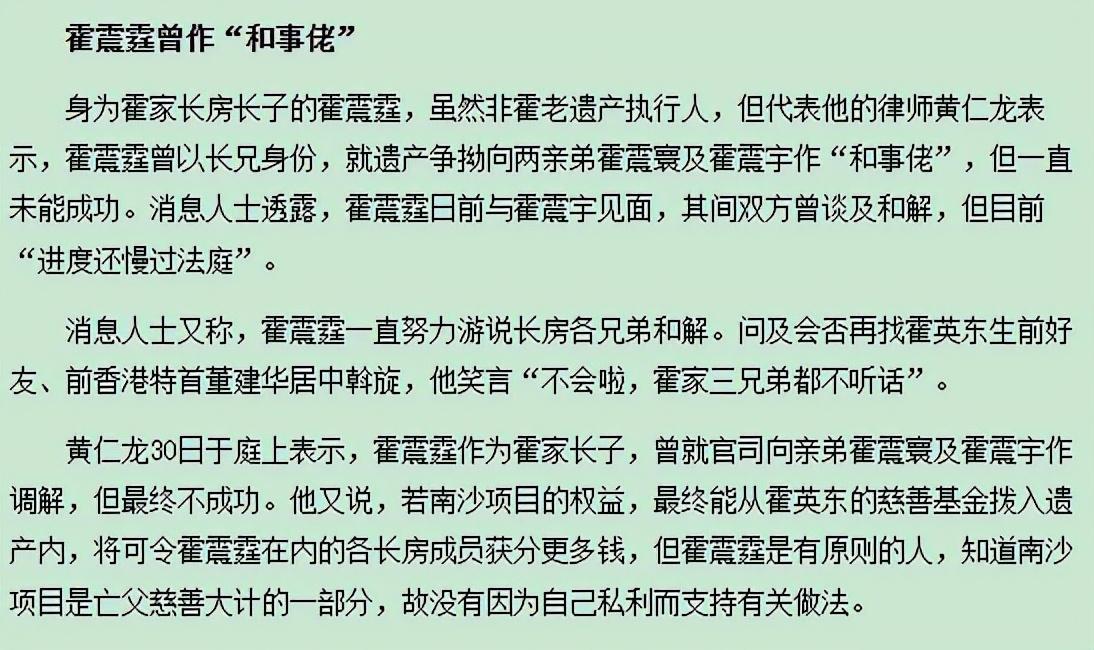 据悉,霍启刚的父亲霍震霆一直是“和事老”,多次为两兄弟调解,并表示南沙项目是亡父慈善大计的一部分,并非子孙的“藏宝箱”。