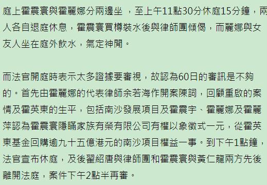 报道称,霍震寰和霍丽娜兄妹在台上分开坐,中途休息也没有交流,霍震寰买了一瓶矿泉水跟律师交流,霍丽娜咋跟女友人在法庭外喝水,气定神闲。