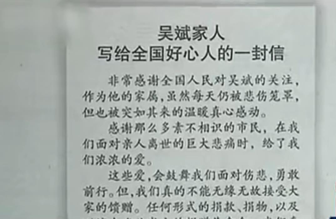 可这一份份的好心,让吴斌的家人们婉言拒绝了。最后更是通过媒体发表了一份感言信。