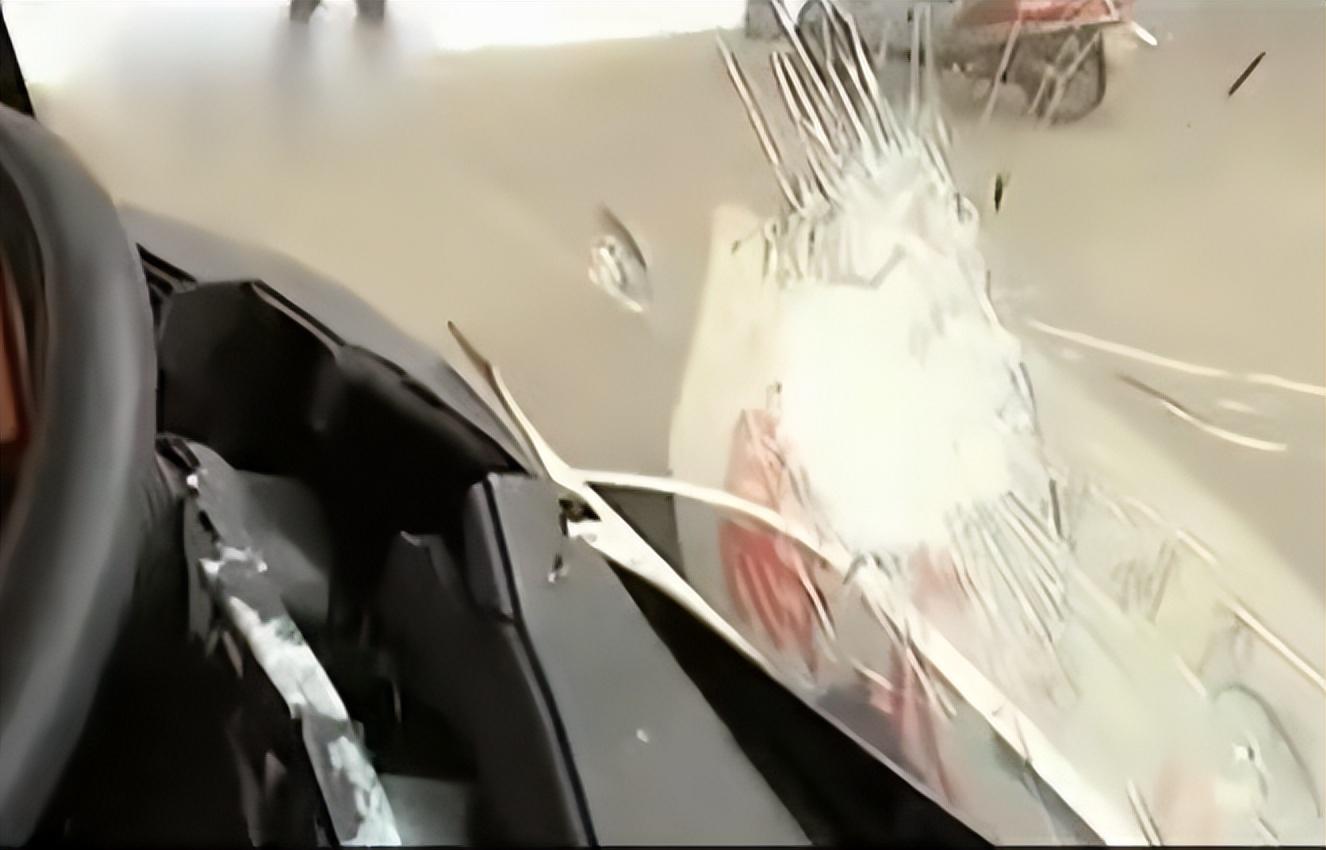 当时对面车道飞来铁块,穿透了前挡风玻璃,之后碰撞了仪表盘表面,之后发生偏移,最后于驾驶员的身体部位发生了碰撞。