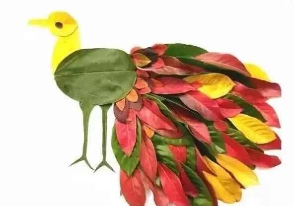 当然有的树叶本身就非常漂亮,不需要剪碎,就能做出好看的作品,还能根据形状、颜色搭配出不同小动物。