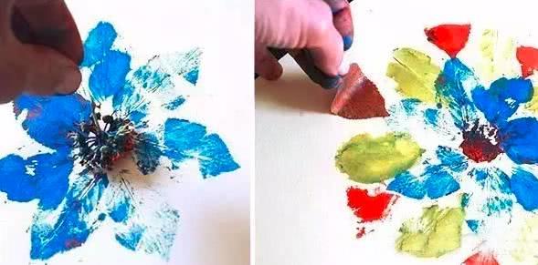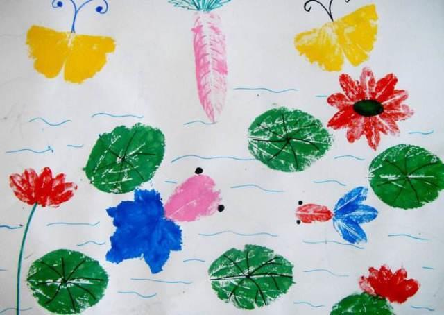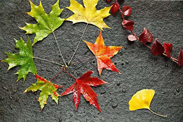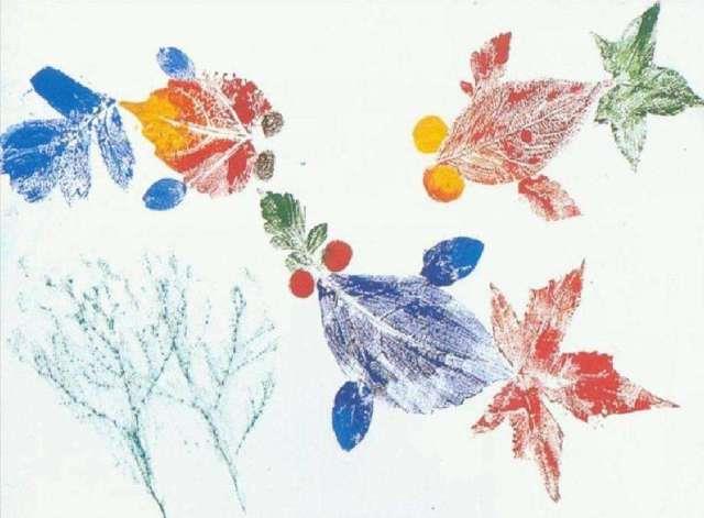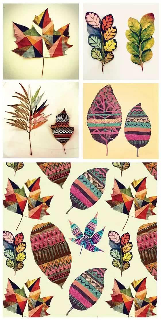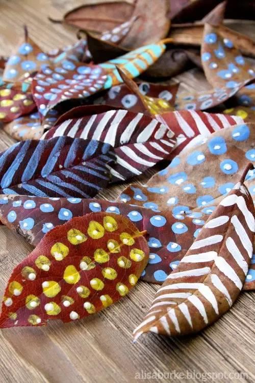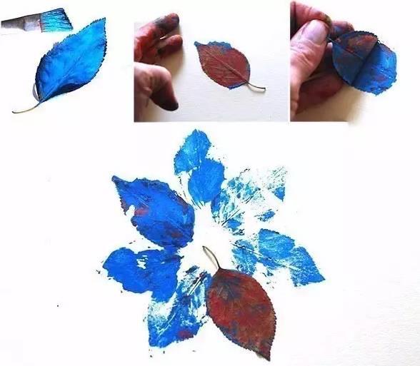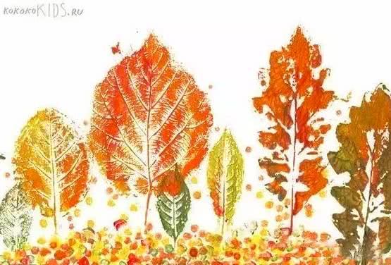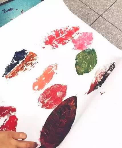 收集各种枯叶,让孩子用彩色颜料绘出自己喜欢的图案。