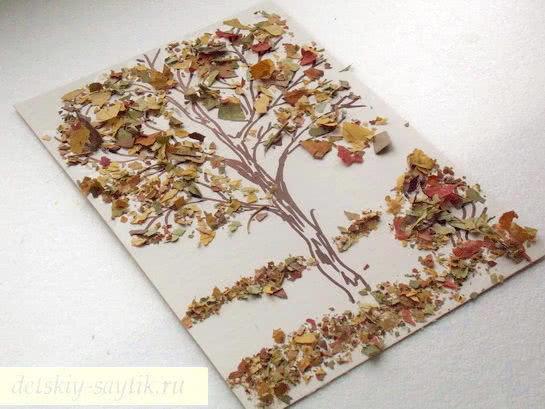 3、将落叶的碎屑贴在大树的枝头和脚下。