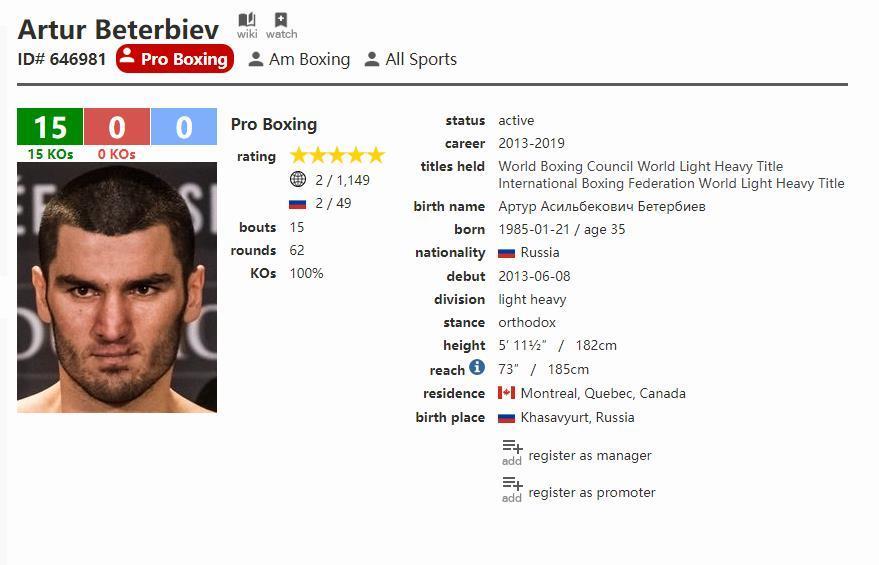 35岁的贝特比耶夫代表俄罗斯参加了2008年和2012年奥运会,但他从未在自己的祖国打职业拳击。为了准备在2013年6月首次亮相,Beterbiev与加拿大发起人Yvon Michel签约后搬到蒙特利尔,之后又与Top Rank签约。
