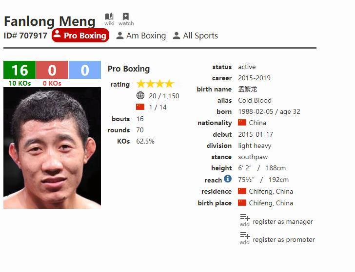 现年32岁的孟繁龙(16-0,10),是2012年奥运会选手,于6月1日在中国澳门赢得了对当时不败的亚当·迪恩斯的一致决定,这场世界冠军淘汰赛成为了贝特比耶夫的强制性挑战者。 10月5日,孟繁龙TKO了9胜8负的卢比奥,打了疫情前最后一场比赛。