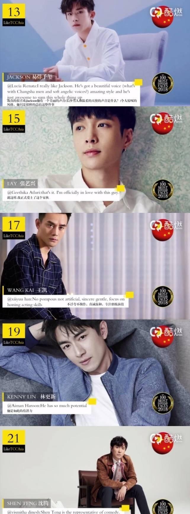 易烊千玺第十三,张艺兴第十五,王凯第十七,林更新第十九,沈腾第二十一。