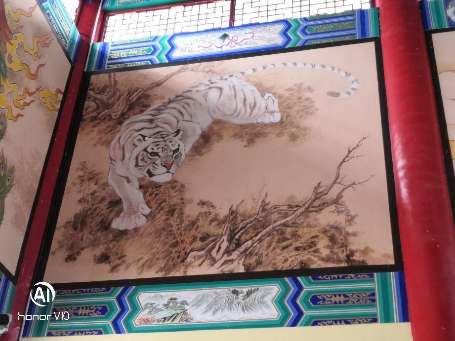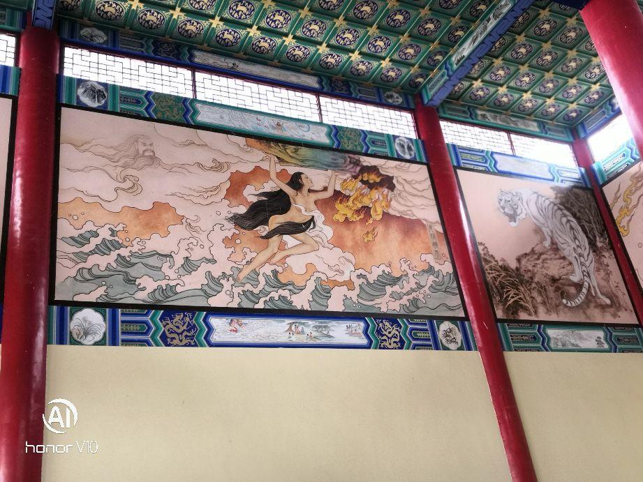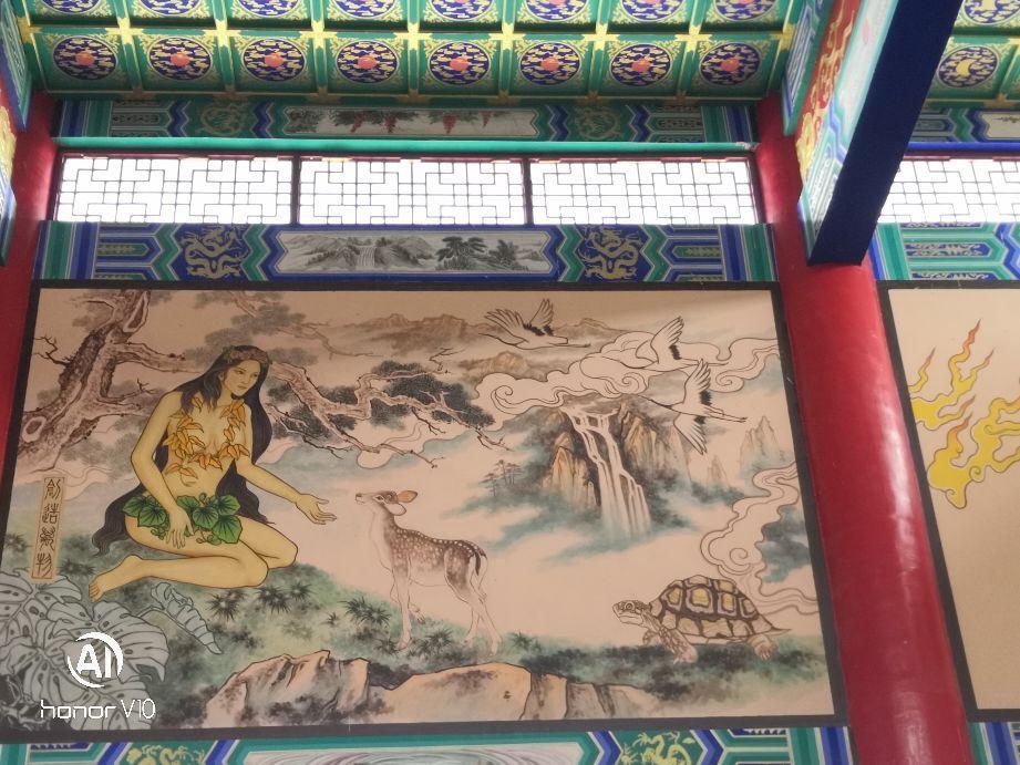 殿内墙壁四周是女娲创世和盘古开天劈地文化壁画,用图画的方式讲述了女娲抟土造人和盘古开启混沌的神话传说。画面精美,形象逼真,栩栩如生。