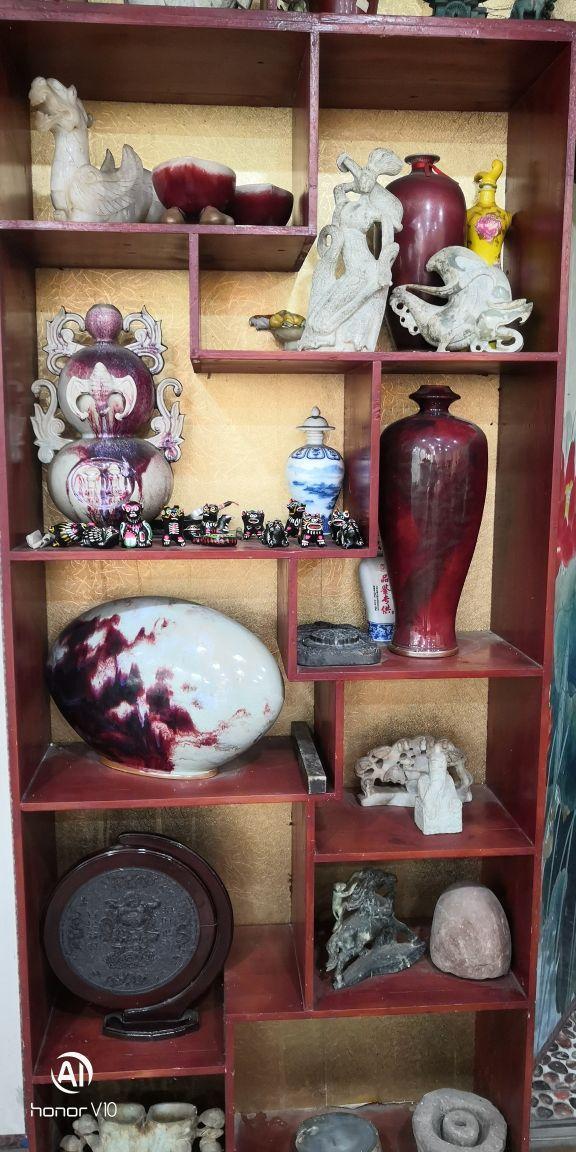 女娲坑北岸,是陶院长的接待室,里面有一个博物架,上面摆满了陶院长收集珍藏的诸多文物,多于女娲或盘古相关。