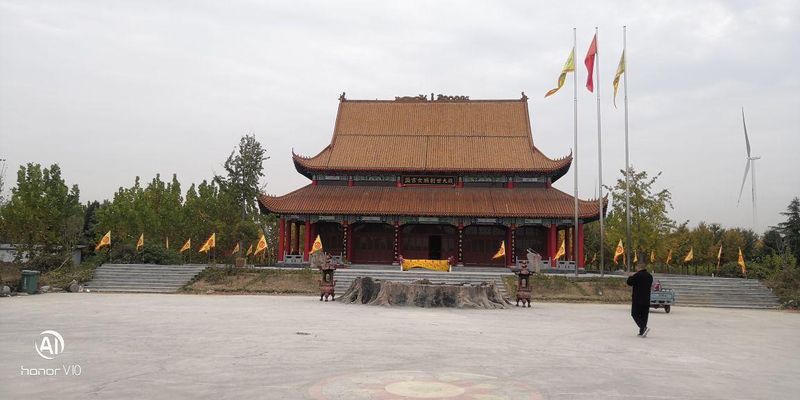 大殿是陶建军院长在2012年主持修建的。盘古开天神斧供奉在大殿广场右侧,女娲补天神石供奉在大殿广场左侧,傲然屹立。