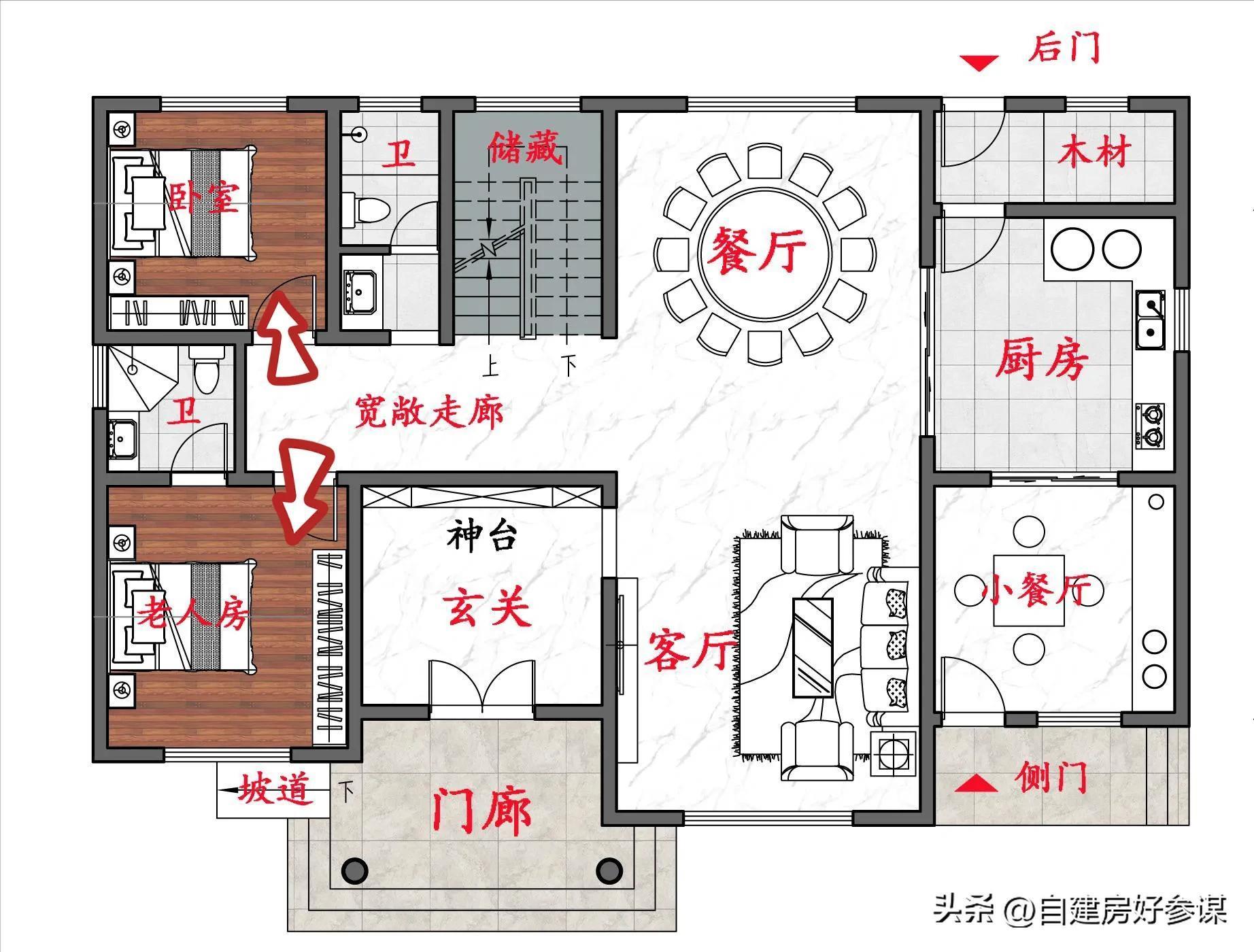 10.首层2个卫生间,不怕过节排队上厕所11.专门留有2个卧室,其中一间朝南12.东厨西卫,听大师的安排,13.楼梯下方加门改为储藏室,
