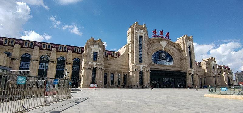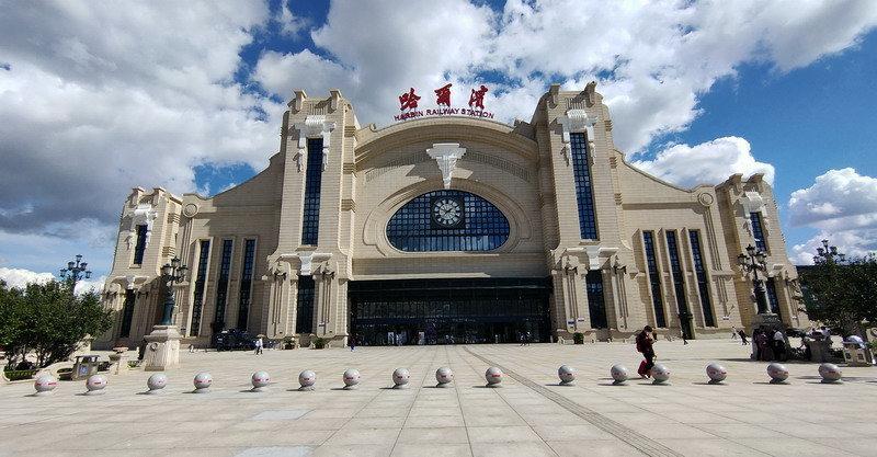 现在的哈尔滨火车站,还原百年前的历史风貌,2个大门的造型都一样,但门旁的延展建筑,一个短,一个长到照不全。
