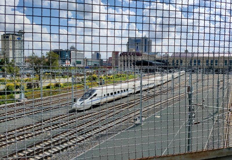 在霁虹桥上,透过铁丝网,远看哈尔滨火车站及桥下的铁轨与高铁。