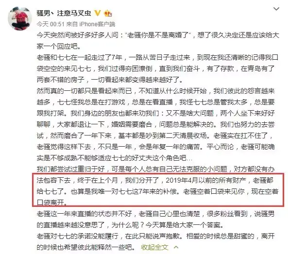 骚男作为前虎牙一哥,至今仍得到平台的重视,他的财产怎么也得有个几千万吧。可是骚男放弃一切财产,只想离婚,他背后到底经历了什么?有网友揣测,骚男是不是干了什么对不起老婆的事情,才会选择净身出户。但也有网友反驳,骚男平常直播的时候一直受气,甚至被扇耳光,他怎么敢去搞事情?像骚男那种妻管严人设,一个大男人连一点尊严都没有了,所以他才选择离婚!