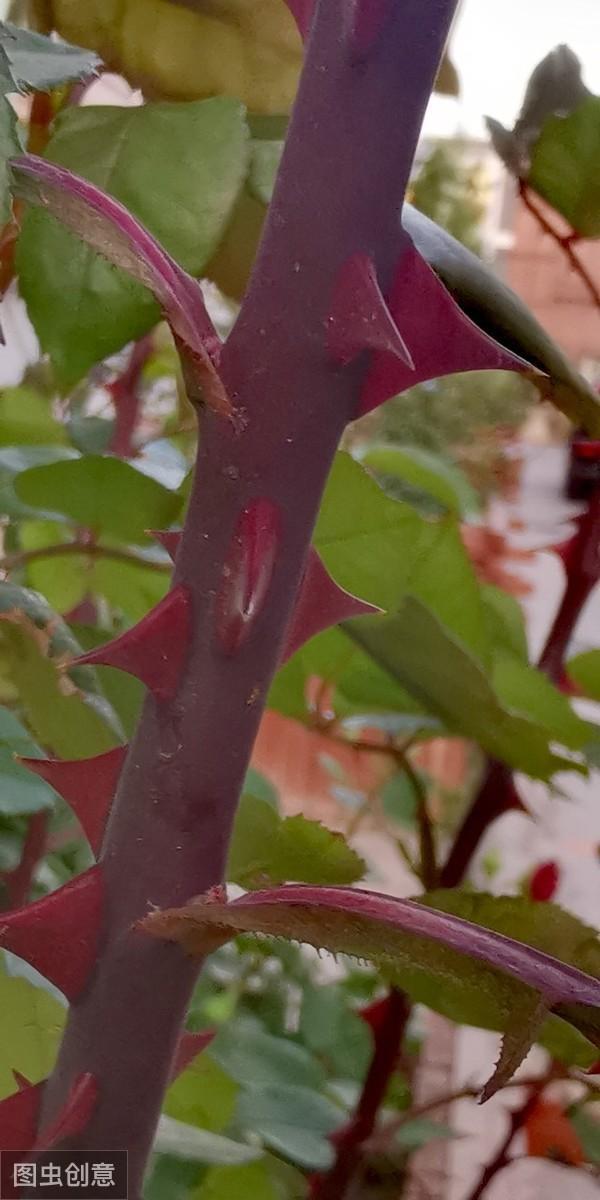 藤本月季自由精神的刺比较多,大刺小刺长得密密麻麻,叶子上都是,打理起来有点难度。就连新长的笋芽和叶芽上,也是成串的刺。去年夏天我在捆绑自由精神的时候,脚下踩空向前扑过去,穿着裙子,腿被扎成了箭靶,想想就冒汗。