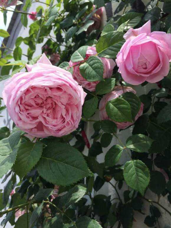 自由精神最大的优点就是生长很自由,从种下成活那一刻开始,就一直自由生长,完全不受限制。它除了笋芽生长速度极快以外,枝干上长出的叶芽也是猛长,各个都长成大高个。所以我的自由精神现在是院子里最高的一株月季,虽然主杆做了横拉,今年春天长出的叶芽都像冲天的白杨一样,需要仰视。