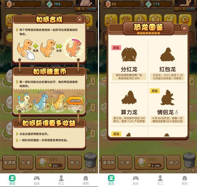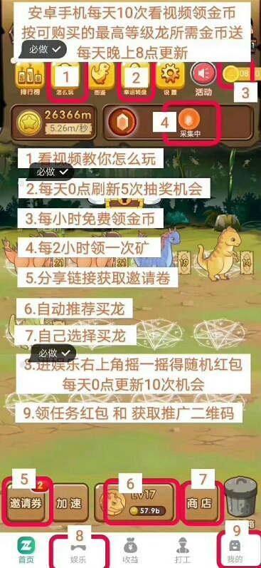 恐龙挂机产金币,幸运转盘,每日领取,打开宝箱看广告,邀请券等多种方法。另外邀请好友还可以获得下级现金提成。