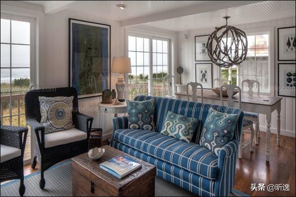 这里向我们展示的天蓝色房间是地中海风格的客厅装修。他们在设计的时候也非常懂得主色与辅色的分别搭配与利用。最为显眼的就是那一张天蓝色的条纹沙发,撑起了主色调的存在感。客厅里挂上了西雅图艺术家乔·马克斯•埃明格尔的画作,为整个空间垫下了基调。古董行李箱可以用作茶几,创意又美观。