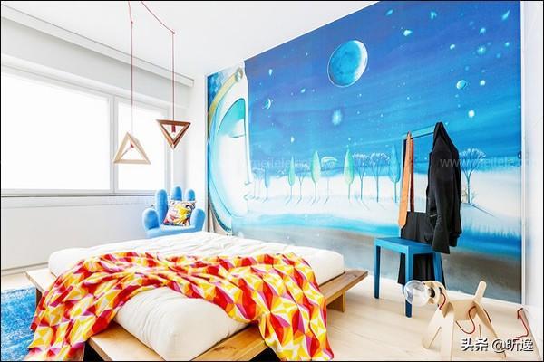 卧室布置成天蓝色是非常好的选择之一,天蓝色与粉红色同为安抚性的色彩,但是粉红色大面积出现在成人的卧室中会给人比较甜腻的感觉,但是天蓝色就能够避免这种尴尬,同时达到的效果也是一样的。天蓝色的“夜空”背景墙给整个房间增添了大面积的色彩,与之同色的地毯也起到了相互照应的效果。
