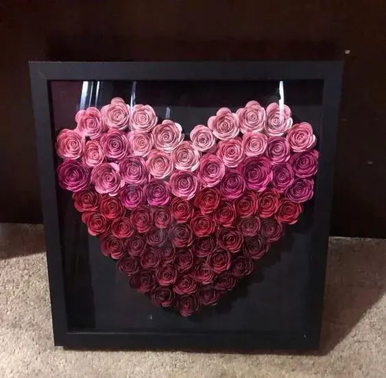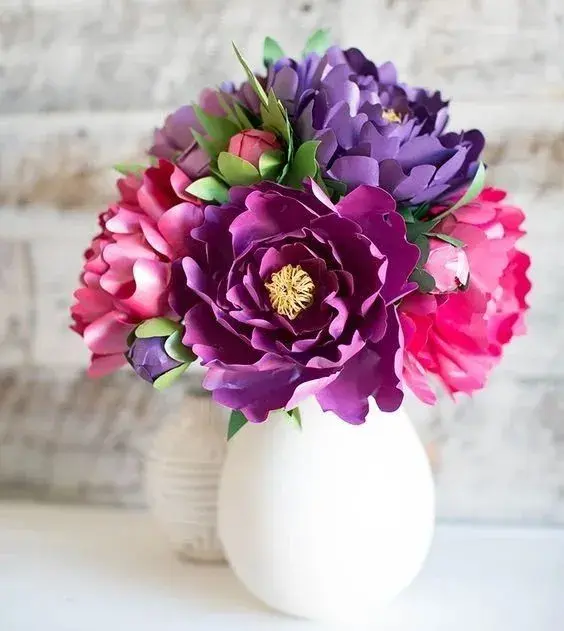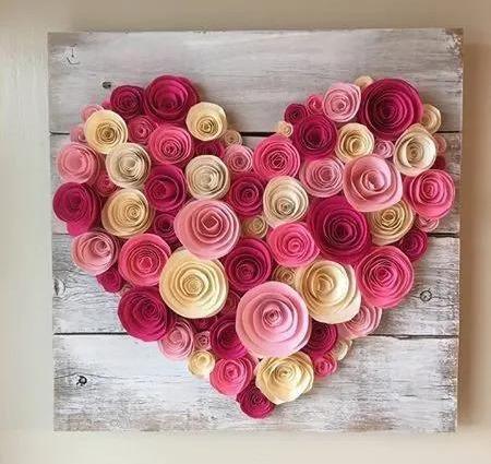 纸花加上叶子可做成一扎扎插于花瓶中观赏,单独一朵朵的花能做墙饰或串成纸花条做室内装饰,拼在一起更能组合出立体的装饰画。