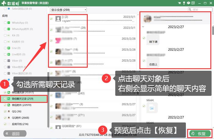 步骤3:扫描完成后,软件默认全选,在左上角可以进行取消。然后在微信里选择需要恢复的聊天记录,右侧还可以进行简单预览。确认无误后点击【恢复】就可以了。