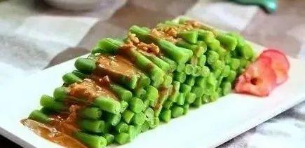 2. 锅中放水烧开,放入豇豆段煮熟,捞出,沥干,放于盘中。