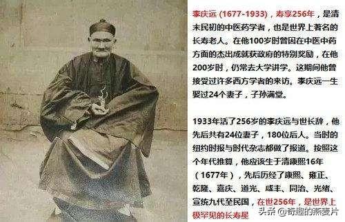10、活了256岁的人中国最长寿的人李庆远一直就是一个未解之谜的中国神秘事件,他活了256岁,据说他在医药方面有着杰出的成就,到了二百岁的时候都有大学请他去授课,他一生有二十四个老婆,子孙更是满堂。