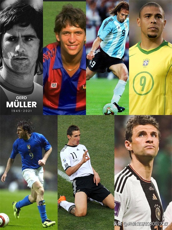 由上至下、从左至右分别是:盖德穆勒、莱因克尔、巴蒂斯图塔、大罗、 维埃里、克洛泽、托马斯穆勒