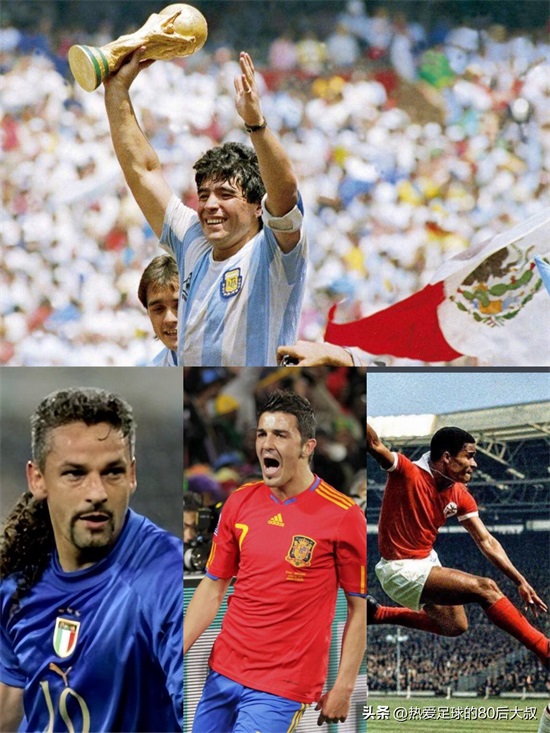 由上至下、从左至右分别为:马拉多纳、巴乔、比利亚、尤西比奥