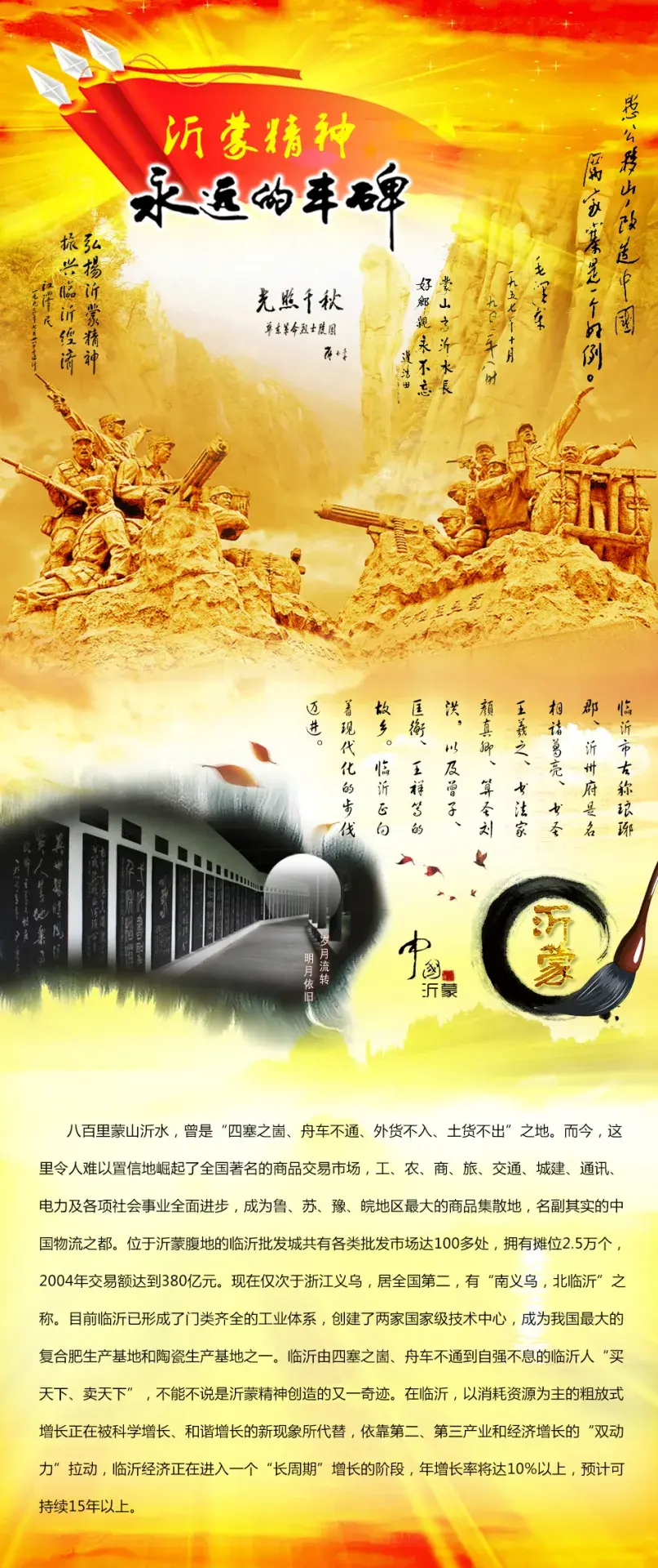沂蒙山革命根据地是抗日战争、国内战争时期中共在国内最重要的根据地之一,为淮海战役的胜利做出了不可磨灭的贡献,是中共山东省政府、中共华东局的创立地,也是国内战争时期国民党重点进攻的解放区(山东解放区)。许多中共领导人和国共两党高级将领曾经在此战斗过、工作过,包括刘少奇、谷牧、徐向前、罗荣桓、陈毅、粟裕、罗炳辉,其中抗日时期,张自忠将军在临沂成功阻击著名的板垣师团,为台儿庄战役的部署取得了时间,为山东整个战局的稳定做出了巨大贡献,张自忠将军是抗日战争时期中国牺牲的军衔最高的将军。沂蒙是一块古老神奇的文化沃土,是一块神圣的红色土地。沂蒙精神是在中国共产党的领导下,在人民军队的哺育下,山东党政军与沂蒙人民共同创造的财富。沂蒙精神代代相传,生生不息,沂蒙人吃苦耐劳、勇往直前、永不服输、无私奉献的沂蒙精神让世人为之动容。从毛泽东同志批示过的历家寨,到全国第一个电气化村刘团村,再到艰苦奋斗的新典型罗庄、沈泉庄、九间棚,体现了临沂人民吃苦耐劳、自强不息的精神风貌。八百里蒙山沂水,曾是“四塞之崮、舟车不通、外货不入、土货不出”之地。而今,这里令人难以置信地崛起了全国著名的商品交易市场,工、农、商、旅、交通、城建、通讯、电力及各项社会事业全面进步, 临沂批发城闻名全国,位居全国综合批发市场第二位,成为鲁、苏、豫、皖地区最大的商品集散地,成为名副其实的中国物流之都。
