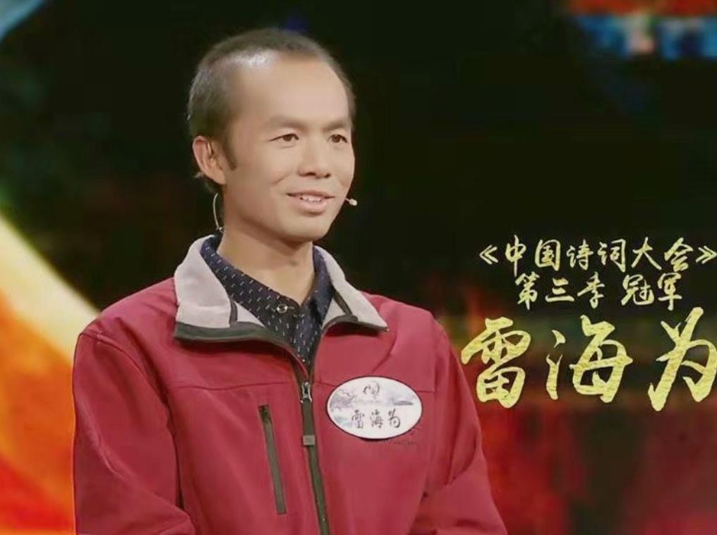 2018年,雷海为登上了《诗词大会》的舞台,初次登台的他,穿着一件朴素的红色外套、皮肤黝黑,说话也带着“口音”。