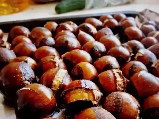 3、烤箱预热200°,将栗子放入铺了锡纸的烤盘中,25分钟。