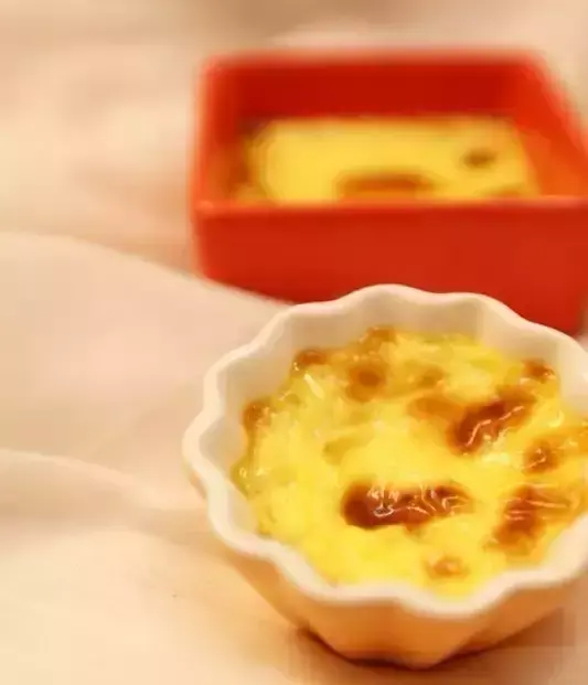 4、将蛋奶液倒入布丁碗内,并在烤盘内注入1-2cm高的热水。放入预热好的烤箱内,以160度烤约40分钟左右即可。