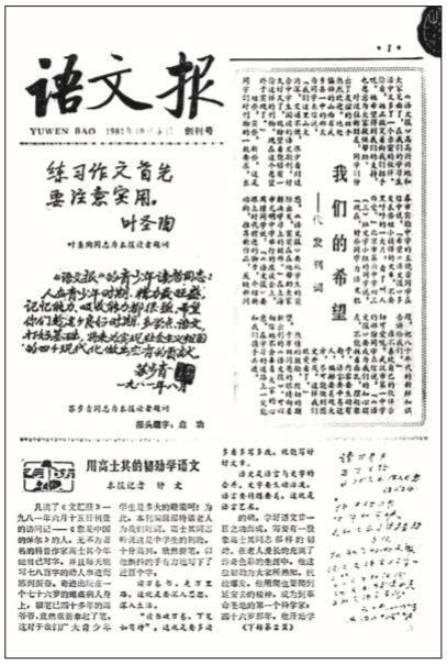 1981 年 10 月 5 日,经过几近一年的策划、调研、碰撞、磨合,带着油墨的清香,带 着一批仁人志士的汗水与智慧,带着丰收季节的喜庆气氛,由著名书法家启功题写报名、中国第一份专门为语文学习服务的《语文报》终于问世了!由于它的内容十分丰富鲜活、精彩有趣,同时又采用新颖而独特的16 开 16 版的版式,可以折叠,便于阅读、携带和保存,立即赢得了社会各界的欢迎和好评。10月11日,新华社及时播发了“《语文报》创刊” 的电讯稿,《光明日报》《工人日报》《文汇报》《山西日报》等报纸都转发了这则消息。《语 文报》首期发行量便高达 78 万份,第二年期发行量超过了100 万份,第四年期发行量飙升到198万份,成为当时全国发行量最大的10种报刊之一。它的读者中,既有中小学师生,也有农民、工人、部队官兵和机关干部,可谓老少咸宜、人见人爱。