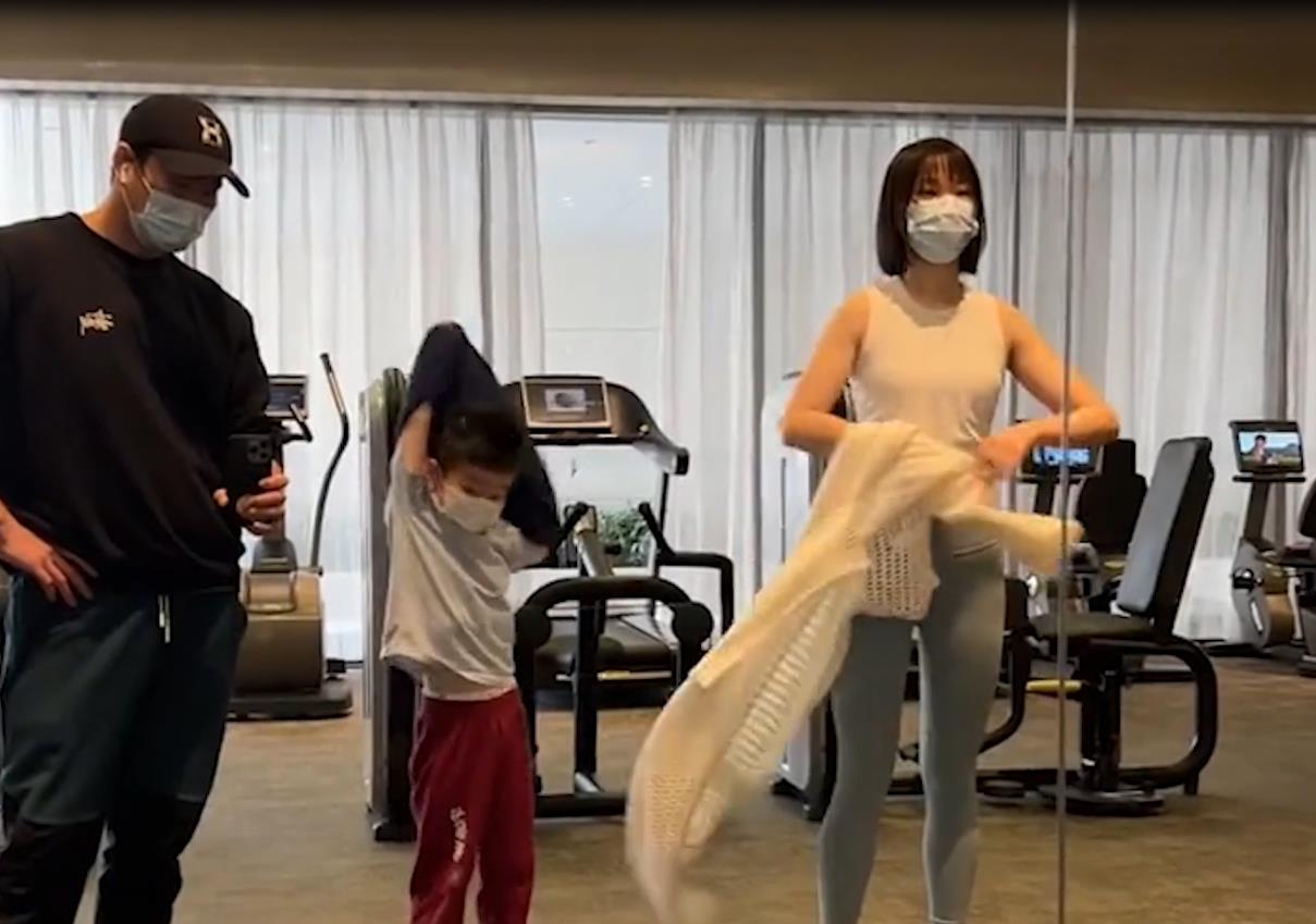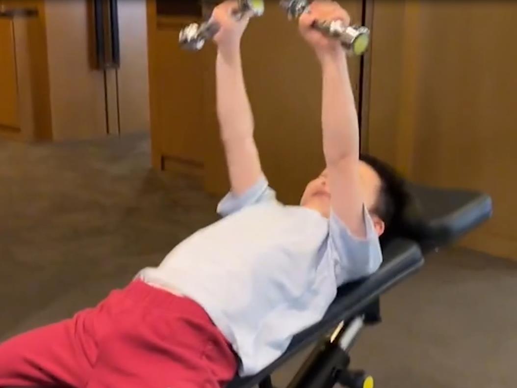 耳濡目染之下,申驰的儿子也迷上了健身,躺在椅子上双手熟练地举哑铃,颇有几分不输他老爸的气势。
