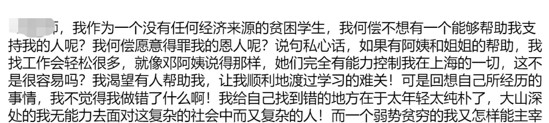 他通篇把自己伪装成一个受害者,谴责孙俪母女说要资助他到大学毕业,却不守承诺中途停止资助。他说他错就错在太年轻太淳朴了,从大山里走出的他没有能力去面对这个复杂的社会复杂的人,还说自己太幼稚,不懂得和言不由衷的人交往,而弱势贫穷的他又能怎么办呢!
