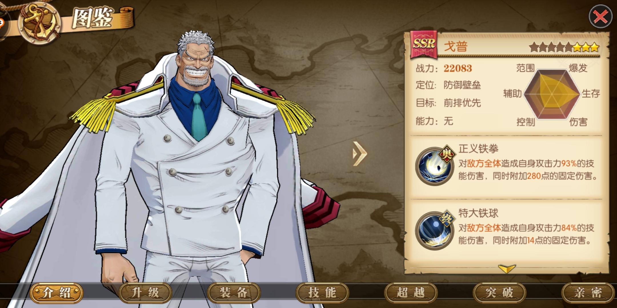 卡普在目前所有的SSR之中,有着最高的初始血量,也就意味着卡普是一名不折不扣的肉盾坦克,甚至可以说,如果赤犬不是因为有着每回合护盾加持,游戏之中的T1坦克,非卡普莫属的。