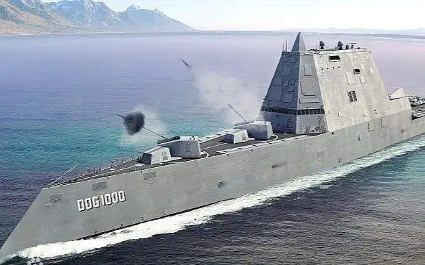 美国海军“朱姆沃尔特”号导弹驱逐舰先进舰炮系统发射假想图