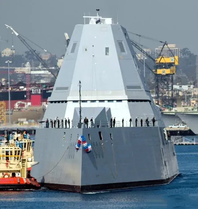 美国海军“朱姆沃尔特”号驱逐舰(DDG-1000),是新一代突出对地打击的宙斯盾舰,本级舰从舰体设计、电机动力、指管通情、网络通信、侦测导航、武器系统等,无一不是超越当代、全新研发的高科技结晶,展现了美国海军的科技实力、财力的雄厚以及设计思想上的前瞻,是美国海军新世代主要水面舰艇。该舰由马里兰州巴斯钢铁造船厂研制生产,2016年10月15日“朱姆沃尔特”号正式加入美国海军服役,2022年9月27日该大型宙斯盾导弹驱逐舰,被编入太平洋舰队的第七舰队,针对中国和俄罗斯意味浓厚,2000年7月4日当时的美国总统比尔·克林顿,以曾任美国海军军令部长,在2000年1月20日去世的小埃尔莫·R·朱姆沃尔特上将来命名该宙斯盾舰。舰长182.8米舷宽24.1米吃水8.1米,满载排水量14564吨,动力系统采用两座英国劳斯莱斯MT-30主燃气涡轮发电机组/72兆瓦(96553马力),两座英国劳斯莱斯4500辅助燃气涡轮发电机组/8兆瓦(10728马力),两座永磁电进电机(合计78兆瓦,约104557轴马力),IEP双轴推进,最大航速30节,舰员140人。一座AN/SPY-3X频多功能相控阵雷达(MFR)(由三具固定式阵列天线组成);一座整合光电侦测/射控系统;整合式双频主/被动舰艏声纳;LBVDS轻量化变深宽频声纳;AN/SQR-20多功能拖曳阵列声纳(MFTA);ISDS整合式防卫系统;NWCS海军对地武器控制系统;IUSW整合水下作战系统。舰艏两座AGS可隐身155毫米/62倍径先进舰炮系统,20*四联装MK57先进垂直发射装置(AVLS)(总装填量80枚,可搭载发射雷神公司“标准”系列区域防空导弹、“海麻雀”ESSM短程防空导弹、对陆攻击战术型“战斧”巡航导弹、ALAM先进对地导弹、垂直发射反潜火箭(VLA)等),近防系统有2*30毫米MK46舰炮,舰尾直升机机库,可搭载2*MH-60R近海作战反潜直升机,或者1*MH-60R近海作战反潜直升机与3*RQ-8A遥控飞行载具,2*7米长RHIB硬壳膨胀快艇。美国海军“朱姆沃尔特”号大型宙斯盾驱逐舰,大量采用超前隐身设计,在海上作业时被发现的概率远低于10%,舰面上只有一个单一的全封闭结构船楼,即称为整合式复合材料船楼与孔径系统(IDHA),整个结构与上面的天线设计都由雷神公司负责,IDHA是一个一体成型的模块化结构,采用重量轻、强度高、雷达反射性低且不会锈蚀的复合材料制成,整体造型由下往上向内收缩,以最大限度降低雷达反射截面积(RCS),且该舰由于采用创新革命性的“整合式全电力推进系统”(IEP),巡航时噪音只有110分贝,相当于“洛杉矶”级攻击核潜艇的后期改进型的噪音水平,满载排水量近15000吨的“巨无霸”,确实足够安静隐秘,归纳起来该舰具备10项创新关键技术:(1)、穿浪逆船舷舰体;(2)、MK57垂直发射系统(靠近船舷的舰体周边垂直发射系统PVLS);(3)、整合式复合材料舰岛与孔径(IHDA);(4)、红外线模型(IR-Mockups);(5)、整合式全电力推进系统(IEP);(6)、双波段雷达系统(DBR);(7)、整合水下作战系统(IUSW);(8)、先进舰炮系统(AGS);(9)、舰上共同运算环境(TSCE);(10)、自动火灾抑制系统(AFSS)。当然由于采用了众多的创新科技,难免会时常出现这样那样的问题,但是瑕不掩瑜,“朱姆沃尔特”级宙斯盾驱逐舰,是全世界目前在役的高科技水平巅峰之佳作,我们对于美国高科技还是需要实事求是的唯物辩证法态度,不要鸡蛋里挑骨头,不要全盘否定,更不要夜郎自大,而要见贤思齐
