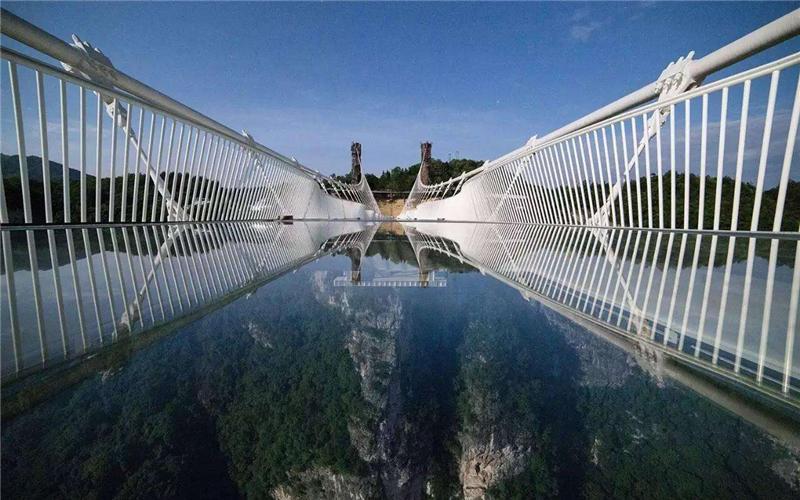 张家界大峡谷玻璃桥位于湖南省的张家界大峡谷景区栗树垭和吴王坡区域内,为一座景观桥梁,兼具景区行人通行、游览、蹦极、溜索、T台等功能。主跨430米,一跨过峡谷,桥面长375米,宽6米,桥面距谷底相对高度约300米。这座全透明玻璃桥长度、高度位居世界第一。