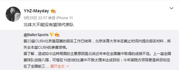 而此事件一出,北体大男篮相关球员也纷纷发声,刚被江苏同曦选中的杨皓喆发文说道:"北体大不能没有篮球代表队。"