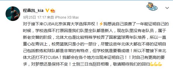 北体大男篮新人程鑫凯发文解释球队为何选择弃赛:"对于接下来CUBA北京体育大学选择弃权!我想说自己浪费了一年能证明自己的时候,学校选择不打原因是我们队里全队都是新人,现在队里没有老队员,属于新老交替的阶段,北体大也是比较特殊学校弄了国家篮球青年队培养,所以一直重心在青训上,校男篮就只是小的一部分,尽管这些年北体大都在不停的证明自己包括教练和球队都是非常的有特点,但学校就是要看成绩!"