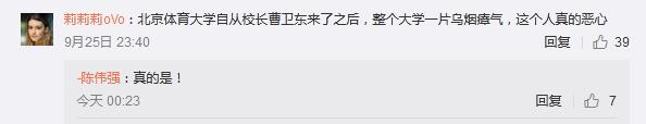 前北体大核心射手陈伟强更是将问题源头直指校方领导,当网友评价道:"北京体育大学自从校长曹卫东来了之后,整个大学一片乌烟瘴气。"时,陈伟强回复道:"真的是!"