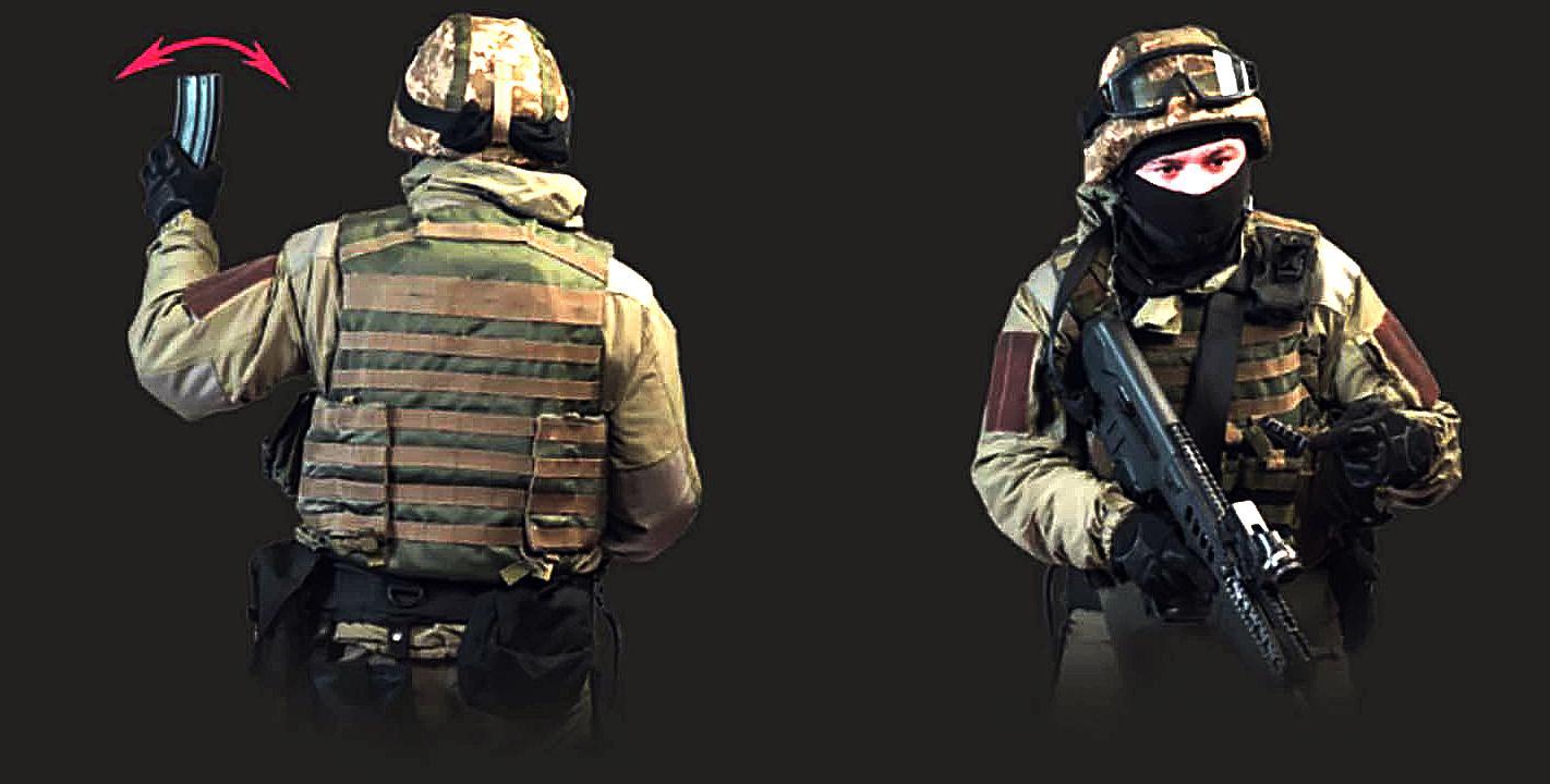 上图右边图示:【自动武器】手指屈曲成爪状,在胸膛前上下扫动。也可以食指向自己手中的自动枪支示意。