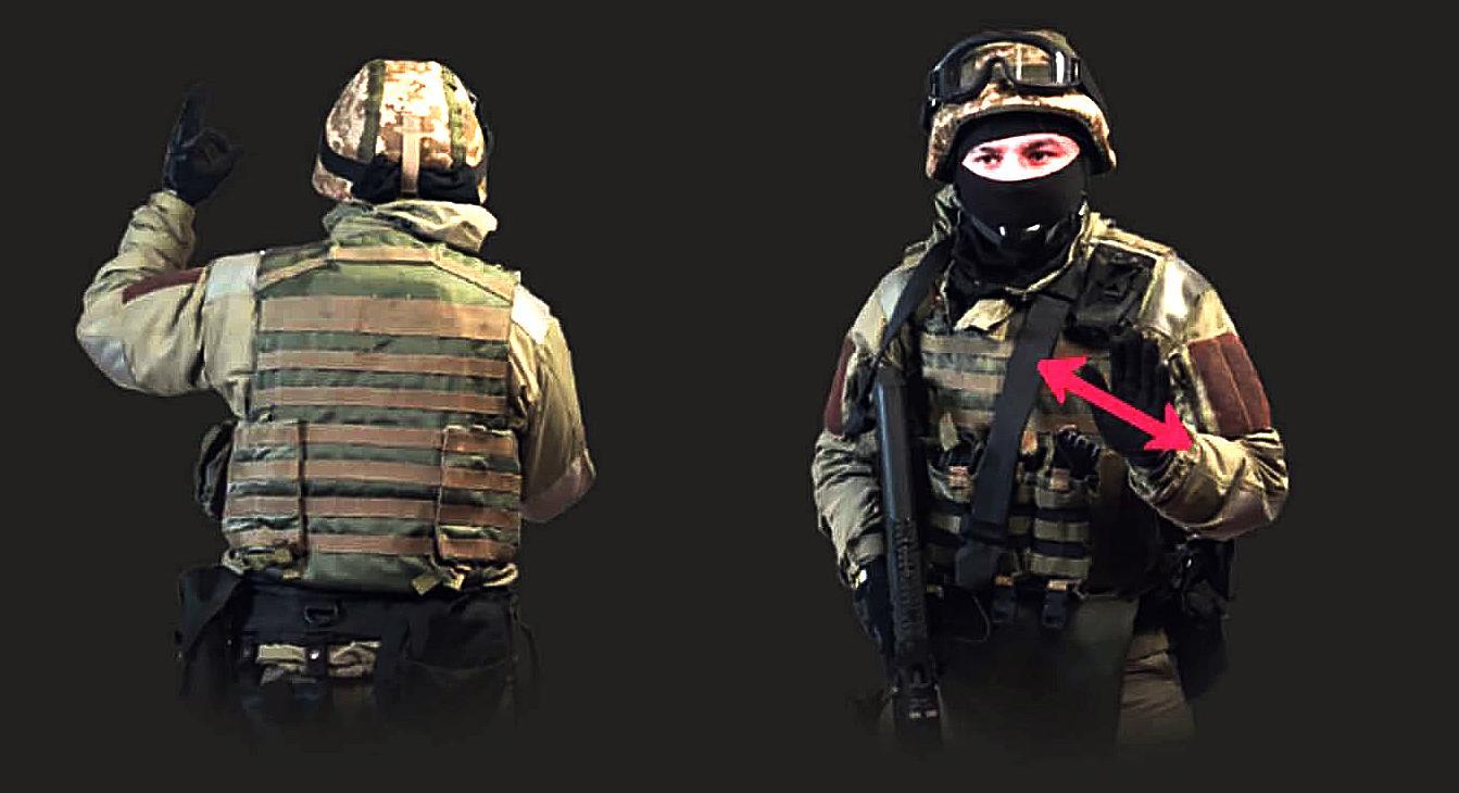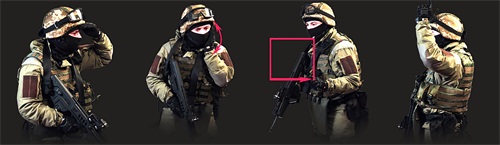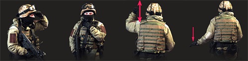 上图左边图示:【步枪】高举手臂,食指和拇指伸直,互成90度。如果发讯者正好握持着步枪,则只需以食指向着手持的武器即可。