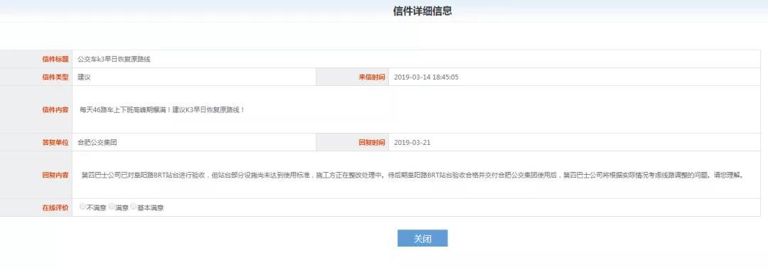 此外,网友留言咨询建议恢复k3路原有路线。官方也正式回复,第四巴士公司已对阜阳路BRT站台进行验收,但站台部分设施尚未达到使用标准,施工方正在整改处理中。待后期阜阳路BRT站台验收合格并交付合肥公交集团使用后,第四巴士公司将根据实际情况考虑线路调整的问题。