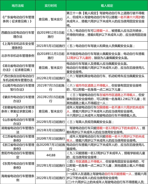 而在广东省下属的3个市级城市肇庆、东莞、汕尾,则对电动自行车的搭载对象上提出“可以附载一名身高1.2米以下儿童”的要求。