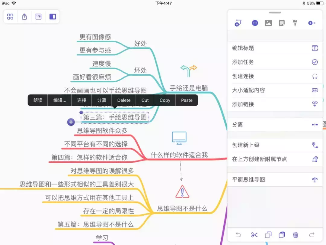 懒癌晚期玄渺渺也不喜欢用下载起来麻烦,使用起来太麻烦的思维导图,这一款和XMIND都是我的心头好,用平板就mindnode、用电脑就xmind。